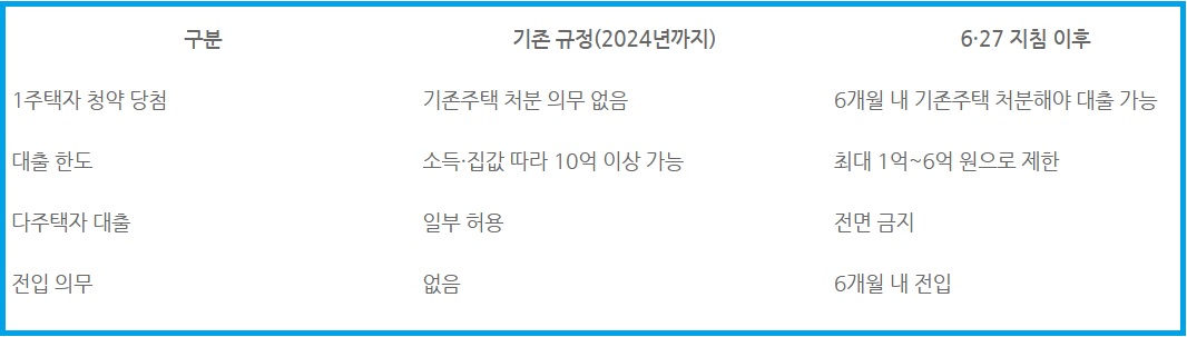 - 1 주택자 청약 당첨 시: 수도권 및 규제지역에서 1 주택자가 청약에 당첨될 경우, 기존 주택을 6개월 내에 반드시 처분해야만 신규 주택에 대한 중도금 및 잔금대출이 가능합니다. 기존에는 처분 의무가 없었기에, 사실상 1 주택자의 ‘갈아타기’가 매우 어려워졌습니다.