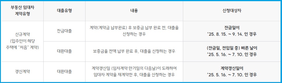 - 대출 기간: 1년 이상, 2년 이내의 기간으로 임대차 계약 만료일까지 설정됩니다. (단, 계약 기간이 1년일 경우 실제 대출 기간이 1년 미만이 되므로 신청이 불가합니다.)