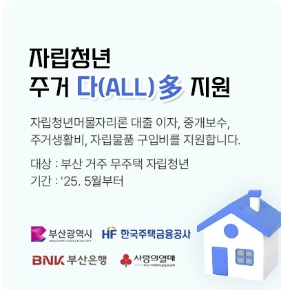 부산시의 '자립청년 주거 다 지원' 사업은 홀로 새로운 시작을 준비하는 청년들에게 단순한 보금자리를 넘어, 꿈을 향해 나아갈 튼튼한 발판을 제공하는 의미 있는 정책입니다. 자격이 되는 청년께서는 이번 기회를 놓치지 마시고 안정적인 주거 환경 속에서 희망찬 미래를 그려나가시길 바랍니다.