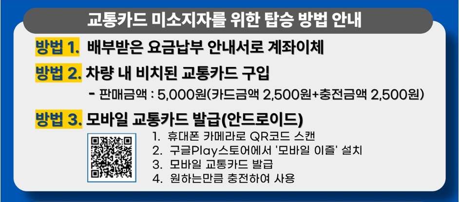 교통카드를 미리 준비하시어 불편 없는 버스 이용을 부탁드립니다.