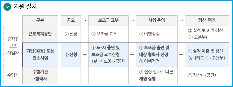- 선정: 근로복지공단은 제출된 서류를 심사하여 보조금을 지원할 기업(간접보조사업자)을 선정합니다.