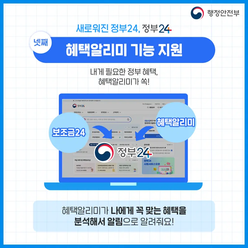 '보조금24'와 연계하여 내가 받을 수 있는 정부 보조금 정보를 한눈에 확인할 수 있으며, 놓치기 쉬운 각종 지원금이나 서비스 정보를 꼼꼼하게 챙겨 받을 수 있도록 도와줍니다. 이제는 똑똑한 혜택 알리미가 여러분의 삶에 숨어있는 정부 혜택을 찾아내어 알려드릴 것입니다.