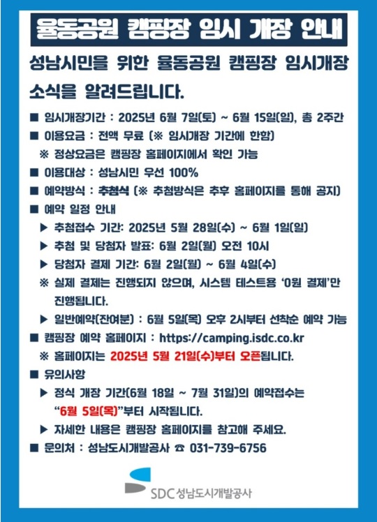 예약 신청은 성남율동캠핑장 공식 홈페이지에서 가능합니다. 신청자가 많을 경우 추첨을 통해 이용자를 선정합니다.