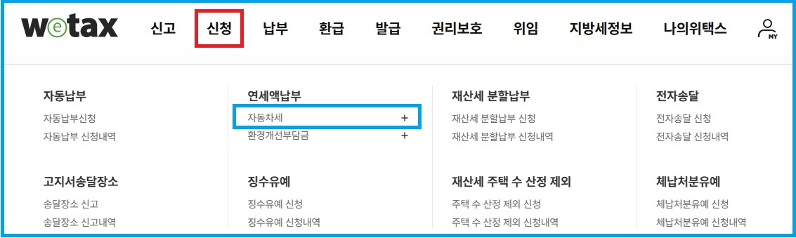 - 위택스(Wetax): [신청] → [자동차세 연납 신청]