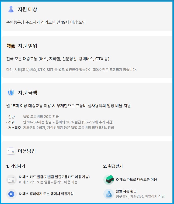 The 경기패스는 별도의 카드를 발급받을 필요 없이 기존의 K-패스 카드를 그대로 사용합니다. 아직 카드가 없다면 총 15개의 카드사(NH농협, KB국민, 신한, 우리, 하나, 삼성, 현대, BC 등)를 통해 K-패스 전용 카드를 발급받으시면 됩니다. 카드를 발급받은 후에는 K-패스 공식 누리집에 접속하여 회원가입을 완료해야 합니다. 이 과정에서 주민등록상 주소지를 경기도로 입력하면, 별도의 추가 신청 없이 자동으로 The 경기패스의 강화된 혜택이 적용됩니다. 고물가 시대에 가중되는 교통비 부담, 7월부터 더욱 강력해진 The 경기패스와 함께 슬기롭게 해결해 나가시길 바랍니다.