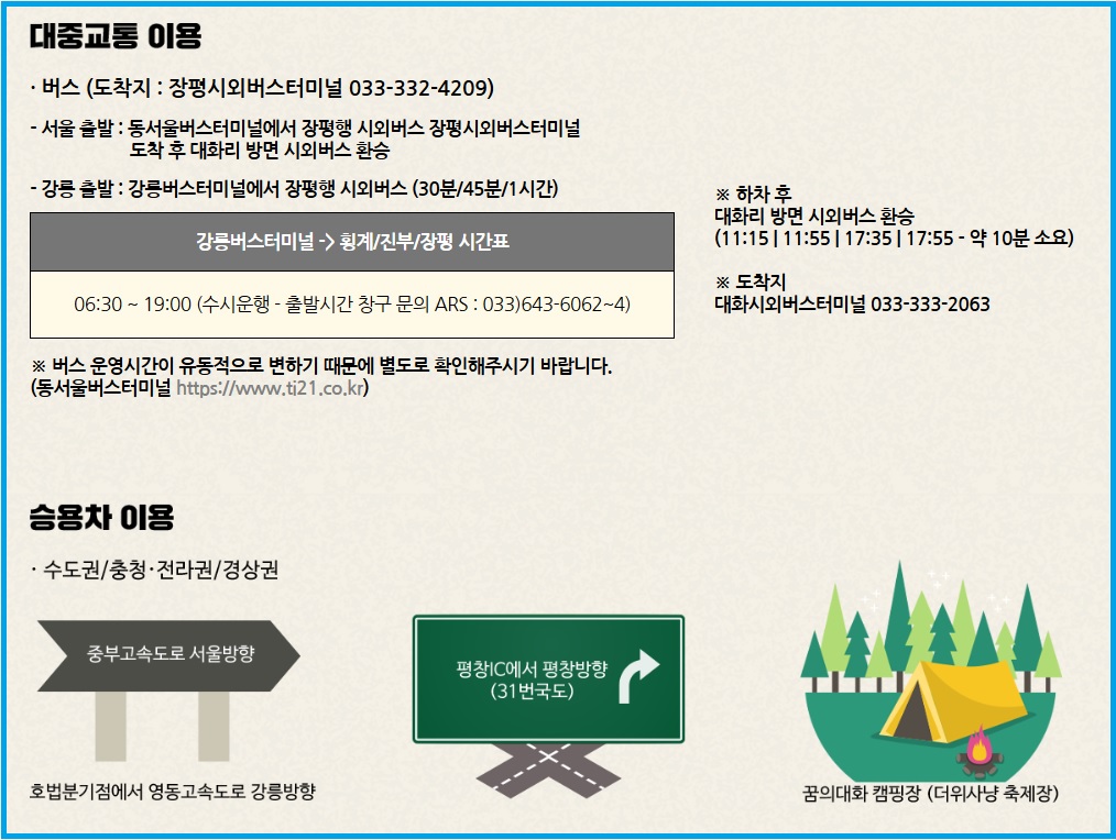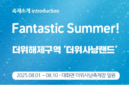 찌는 듯한 폭염이 기승을 부리는 한여름, 시원한 탈출구를 찾고 계신다면 강원도 평창으로 떠나보시길 바랍니다. 강원도를 대표하는 여름 축제인 'SUMMER-HUNTER 평창 더위사냥 축제'가 'Fantastic Summer!'라는 주제 아래 2025년 8월 1일~10일까지 화려한 막을 올립니다. 본 축제가 열리는 평창군 대화면의 땀띠공원은 연중 10℃의 차가운 냉천수가 흐르는 천혜의 자연 피서지입니다. 이곳에서 펼쳐지는 더위사냥 축제는 방문객 여러분의 시원한 여름을 책임지기 위해 역동적인 물놀이 시설과 온 가족이 함께 즐길 수 있는 풍성한 프로그램을 완벽하게 준비하였습니다. 또한 황토방하우스 2동, 캐빈하우스 1동, 글램핑 8동, EPS돔텐트 11동, 고정식데크(오토캠핑,18㎡) 23면이 조성되어 있는 캠핑장도 조성되어 있습니다.