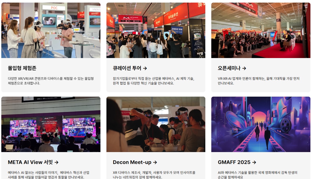 이번 행사는 100여 개가 넘는 국내외 유수 기업들이 참가하여 XR(확장현실), VR(가상현실), 디지털트윈 등 가상·증강현실 기술을 중심으로 각 산업 분야에 적용된 최신 솔루션과 혁신적인 콘텐츠를 대거 선보입니다.